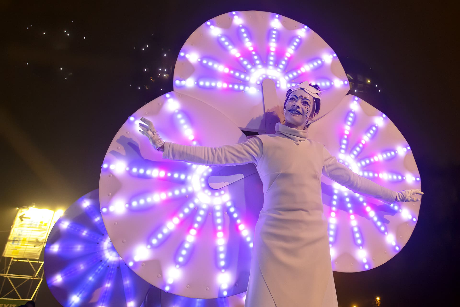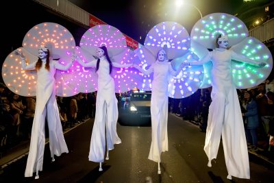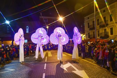 Ces personnages avec leurs parurent féeriques où les couleurs changent et circulent d’un costume à l’autre sans cesse, crée ainsi une expérience visuelle unique. Vivez ce spectacle d’échassiers lumineux hors du commun.